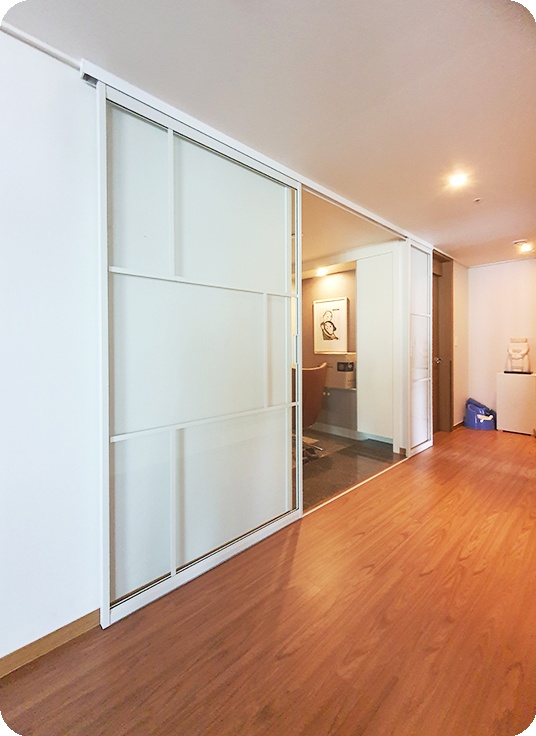 슬라이딩도어는 일반적으로 여닫이 문보다 공간 효율성이 뛰어난 아파트 중문의 대표적인 형태입니다. 좁은 현관에서도 부담 없이 설치가 가능하며, 열고 닫는 동작이 간편해 일상생활의 편리함을 더합니다. 이번 시공에서는 2단 슬라이딩도어를 적용하여 두 개의 문을 모두 열어 넓은 개방감을 느낄 수 있도록 설계했습니다. 이로 인해 사용할 때마다 특별한 분위기를 느낄 수 있습니다.